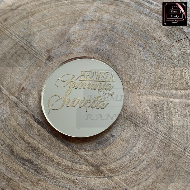 Żeton dekoracyjny z napisem.